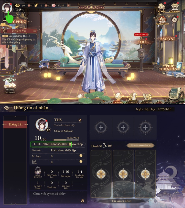 2) ID Học Sĩ của bạn sẽ được tìm thấy ngay dưới thanh kinh nghiệm trong thẻ thông tin nhân vật